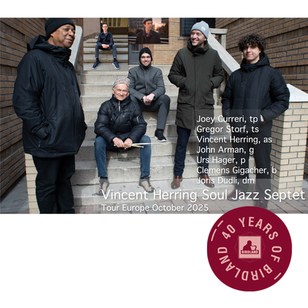 Dieses besondere Projekt ist eine harmonische Mischung aus der europäischen Working Band des amerikanischen Star-Saxophonisten Vincent Herring und seines langjährigen Partners Joris Dudli. Mit dabei sind außerdem das junge Talent Joey Curreri aus Los Angeles und ebenso talentierte Nachwuchstalente aus der österreichischen Jazzszene. Sie haben erst kürzlich Material aufgenommen, das bei ihren Auftritten im Oktober auf der kommenden Tournee erhältlich sein wird. Dort spielen sie funkige Arrangements mitreißender Soul-Jazz-Klassiker und eingängiger Eigenkompositionen. Mehr Infos